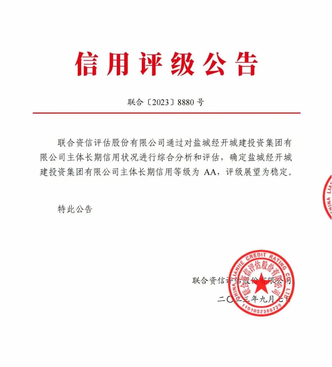 9月7日,經(jīng)國內(nèi)權(quán)威評級機構(gòu)聯(lián)合資信評估股份有限公司(簡稱“聯(lián)合資信”)綜合分析評定,鹽城經(jīng)開城投集團成功獲評AA主體信用評級,評級展望為“穩(wěn)定”。