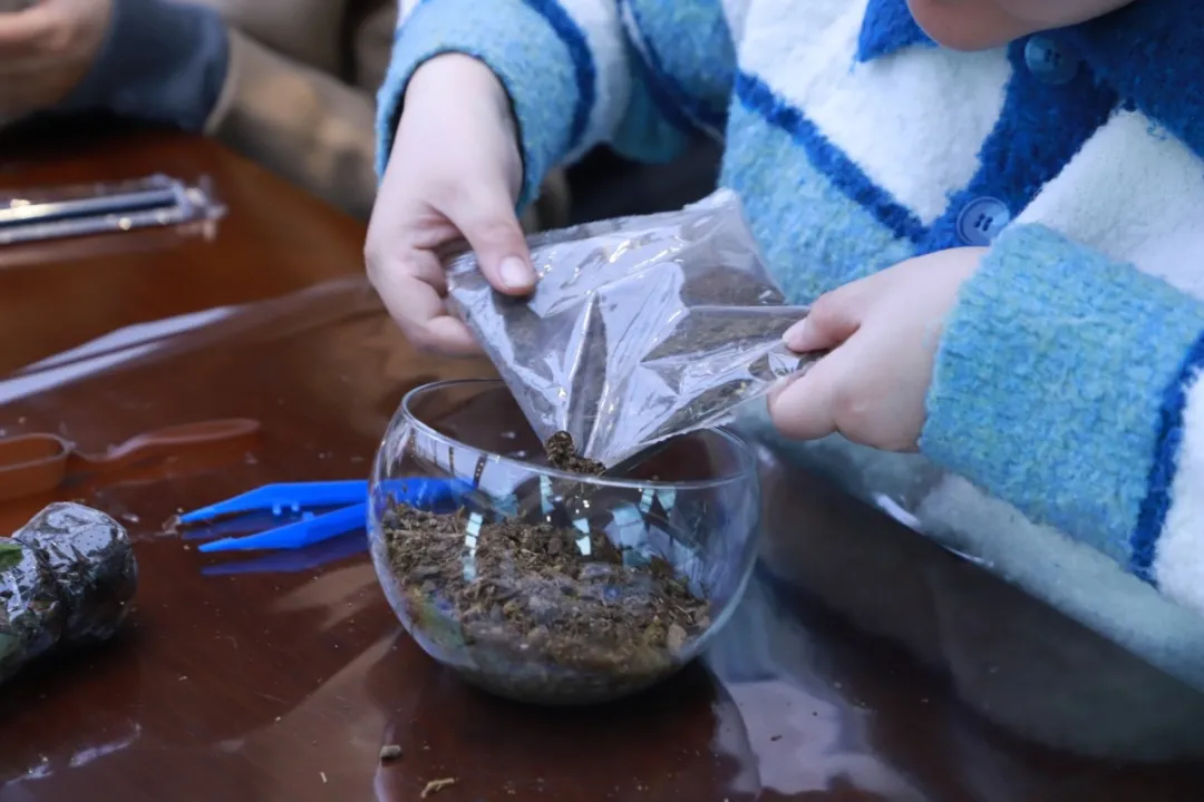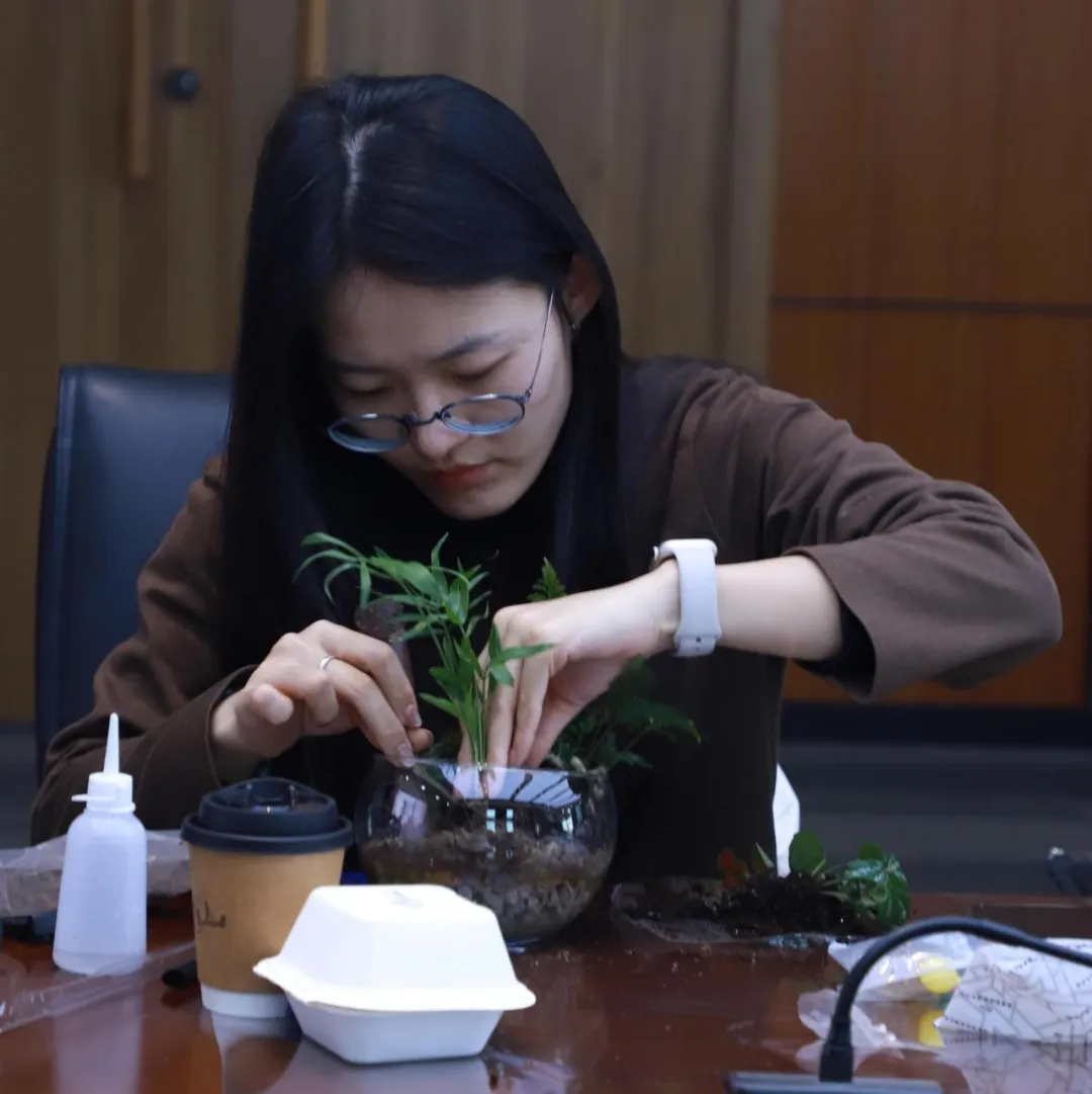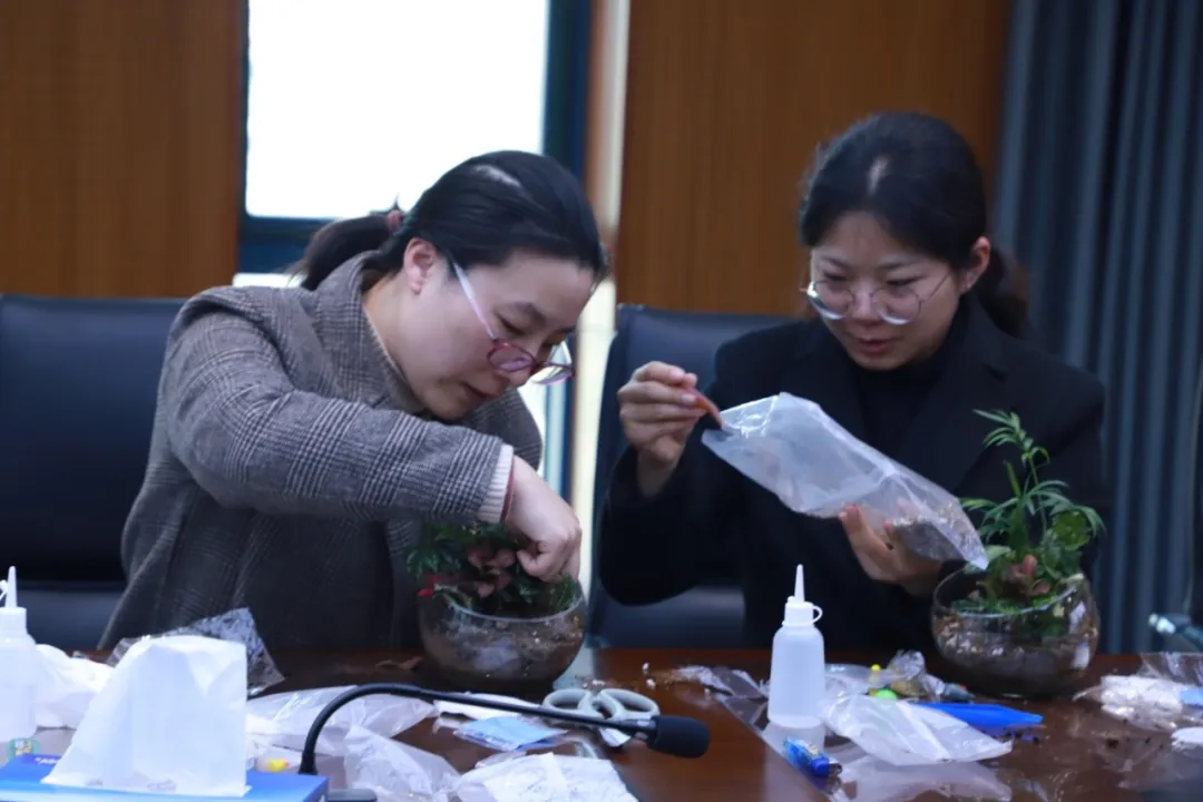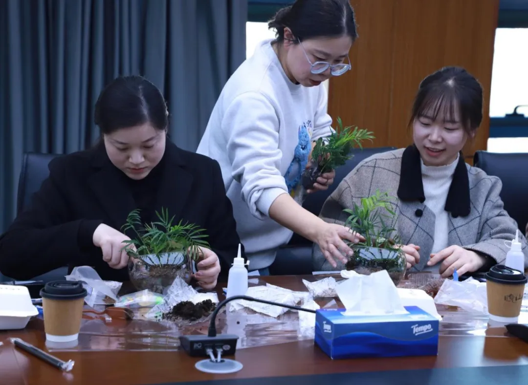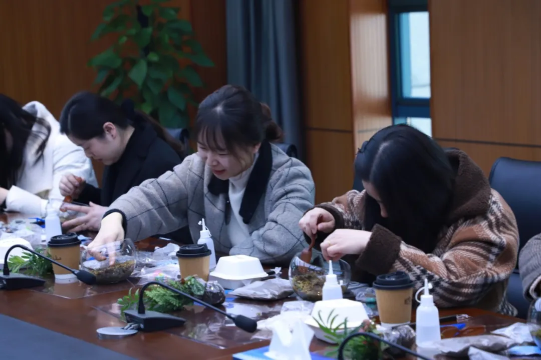 活動特邀專業(yè)指導(dǎo)師全程教學(xué),指導(dǎo)老師詳細(xì)地向大家講解了微景觀的制作步驟和注意事項。在講師的耐心指導(dǎo)下,大家先在透明玻璃盆底部鋪上一層薄薄的小石子作為瀝水層,以確保植物能夠良好地生長;接著用種植土填滿盆內(nèi)的大部分空間,為綠植提供充足的養(yǎng)分;隨后,大家小心翼翼地將綠植放入盆中,根據(jù)自己的審美和創(chuàng)意,將植物擺放成高低錯落的層次感;最后,在微景觀中增添一些可愛的卡通玩偶,讓整個景觀顯得更加生動有趣。在輕松歡快的空間里,全體女職工放下工作壓力,以巧思妙想構(gòu)筑春日盛景,一盆盆綠植在女職工們的指尖流轉(zhuǎn)成詩意盎然的藝術(shù)佳作。